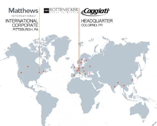 Eines der renommiertesten Unternehmen des Geschäftsbereichs „Memoralization“ ist die Matthews International S.p.A. bekannt als “CAGGIATI“ mit Sitz in Colorno (bei Parma, Italien). CAGGIATI ist eine der weltweit führenden Kunstgießereien für Bronzeartikel. Die Erfahrung und das handwerkliche Können gepaart mit verschiedenen Gussverfahren ermöglicht eine einzigartige Vielfalt an exklusiven Artikeln für den Grabschmuckbereich. Italienisches Design und Perfektion in der Ausführung überzeugen seit Jahrzehnten Kunden rund um den Globus. Sehr geschätzt werden auch die Auftragsarbeiten in Bronze, die individuell auf Kundenwunsch angefertigt werden.